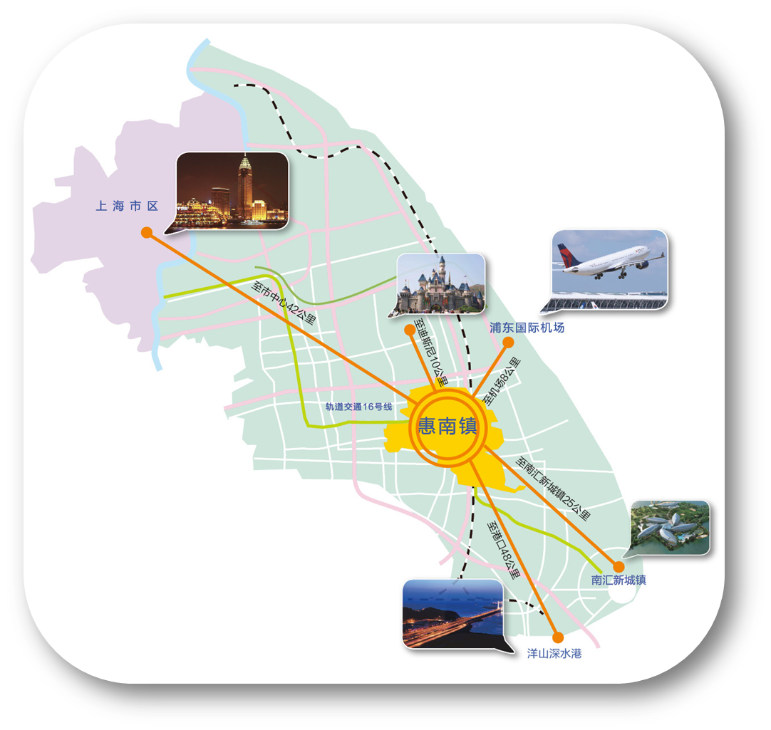 沪上东南门户——惠南镇,地处浦东南部中心,位于海港和空港之间,南离洋山深水港48公里,距南汇新城镇25公里,北距浦东国际机场8公里,距上海市中心42公里。 周边与迪士尼旅游度假区、商飞总装基地、临港产业区毗邻。拥有立体式交通条件。